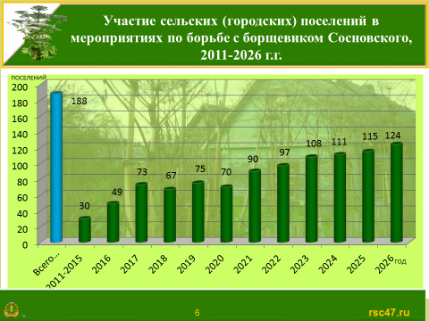 Ежегодно количество поселений, которые принимают участие в Программе «Комплексное развитие сельских территорий Ленинградской области» по борьбе с борщевиком Сосновского, увеличивается. Впервые примут участие в программе ещё 9 городских/сельских поселений. Общая площадь обработки их территорий составит 107,03 га.